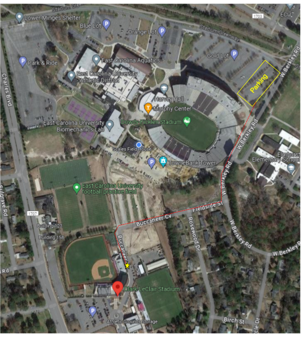 - Limited Parking is available at ECU Parking. You must text for a pass at least 48 hours before the event.